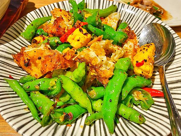 豆瓣醬大火快炒清脆且甜香的糯米椒,搭配近全熟的炸蛋,吃到蛋黃爽度很夠,帶點微辣實在很下飯
